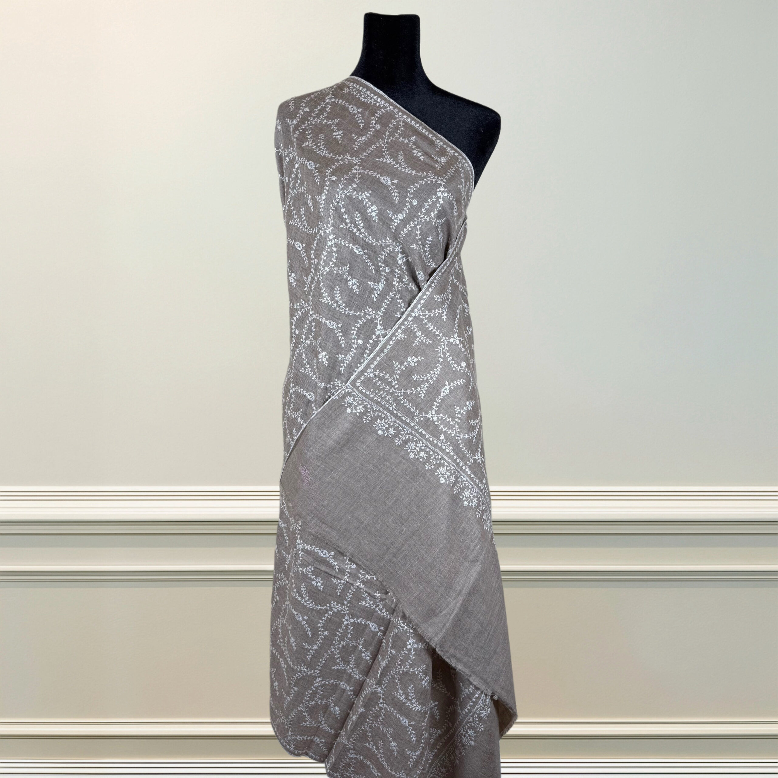 Its soft taupe canvas is brought to life with ivory floral vine motifs—stylized like the tender almond blossoms (badam phool) that sweep across the valley’s orchards each spring. Ethereal yet earthy, this piece is designed for those who find strength in subtlety and beauty in quiet elegance.