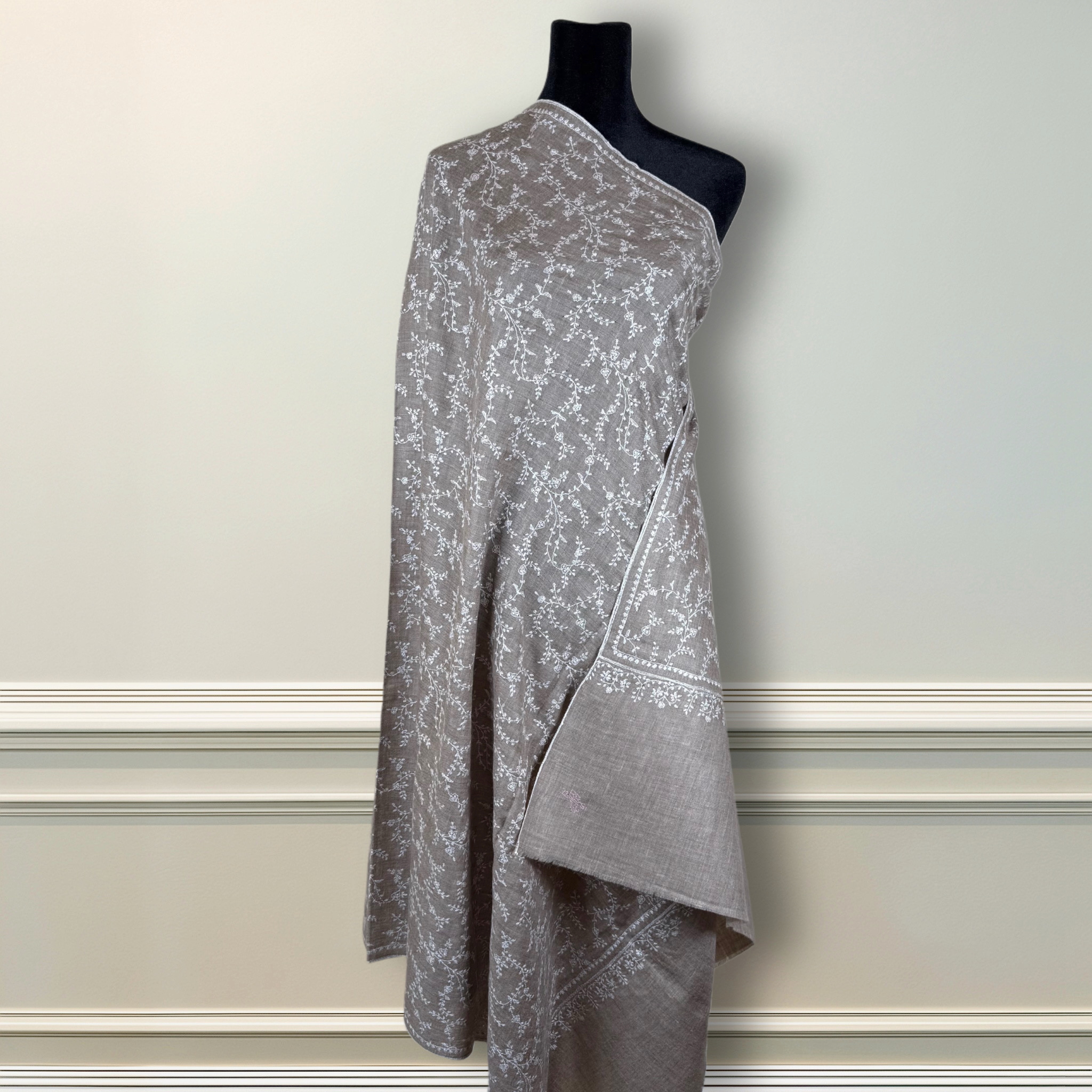 Delicate as moonlight and steeped in heritage, Chand-e-Nazneen — “the beloved moon” — is a masterpiece of subtle elegance. This handwoven Pashmina shawl, crafted from the softest Himalayan wool, features a refined ivory base brought to life with intricate Sozni embroidery in dusty white and charcoal.