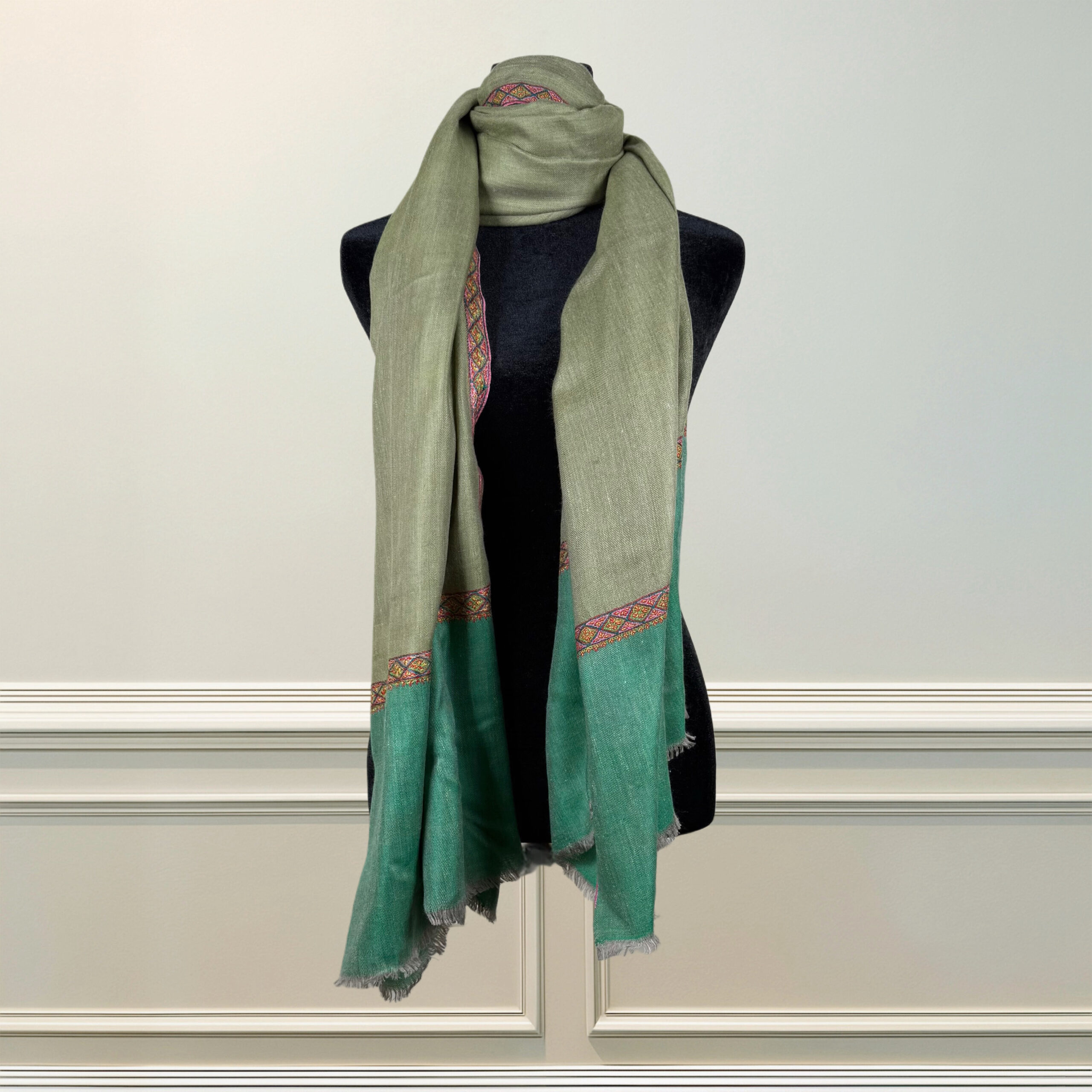 A breath of spring wrapped in softness — Gulrukh-e-Sabz (Green Grace) is an ode to new beginnings and serene beauty. Handwoven in Kashmir from fine wool, this shawl glides from a muted sage green into a refreshing mint base, like alpine meadows kissed by morning mist.