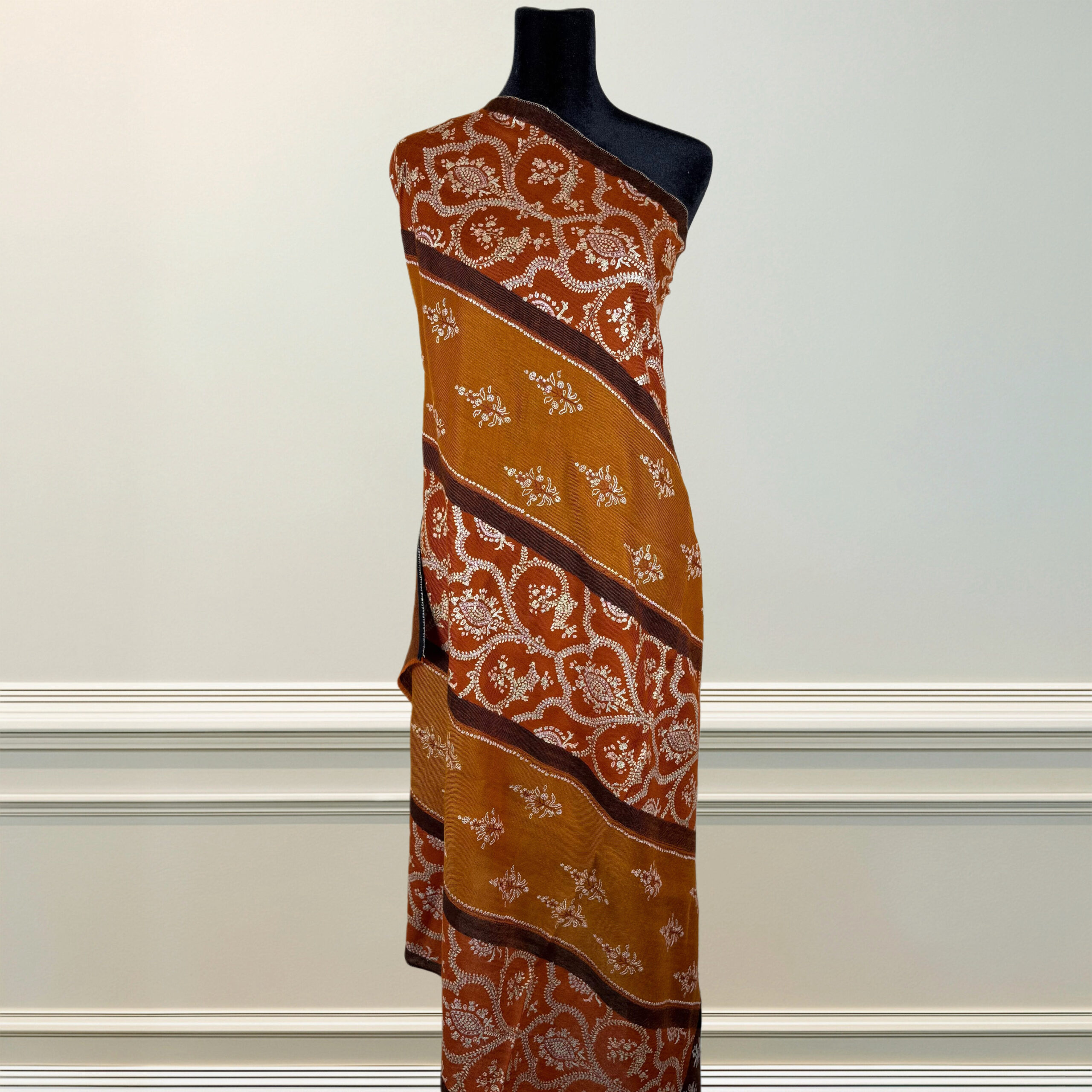 The rhythmic florals evoke the blossoms that dot the saffron meadows of Pampore, while the geometric banding adds visual structure and movement. Lightweight, breathable, and sumptuously soft, this artisanal piece is a celebration of Kashmir’s botanical beauty and craftsmanship legacy.