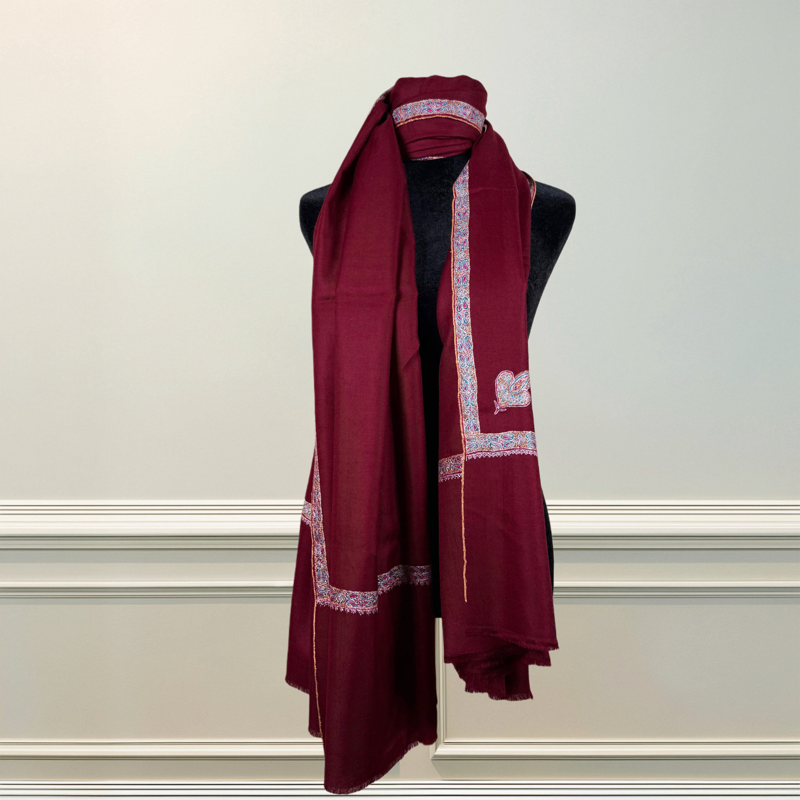 Graceful and regal, Mahfil-e-Gul (Gathering of Blossoms) evokes the quiet grandeur of an intimate evening soiree in the heart of the valley. Cloaked in a rich maroon hue, reminiscent of aged wine or crimson velvet, this handwoven shawl is delicately embroidered with pastel Sozni borders and a refined corner paisley motif — like floral murmurs gracing the hem of a royal robe.