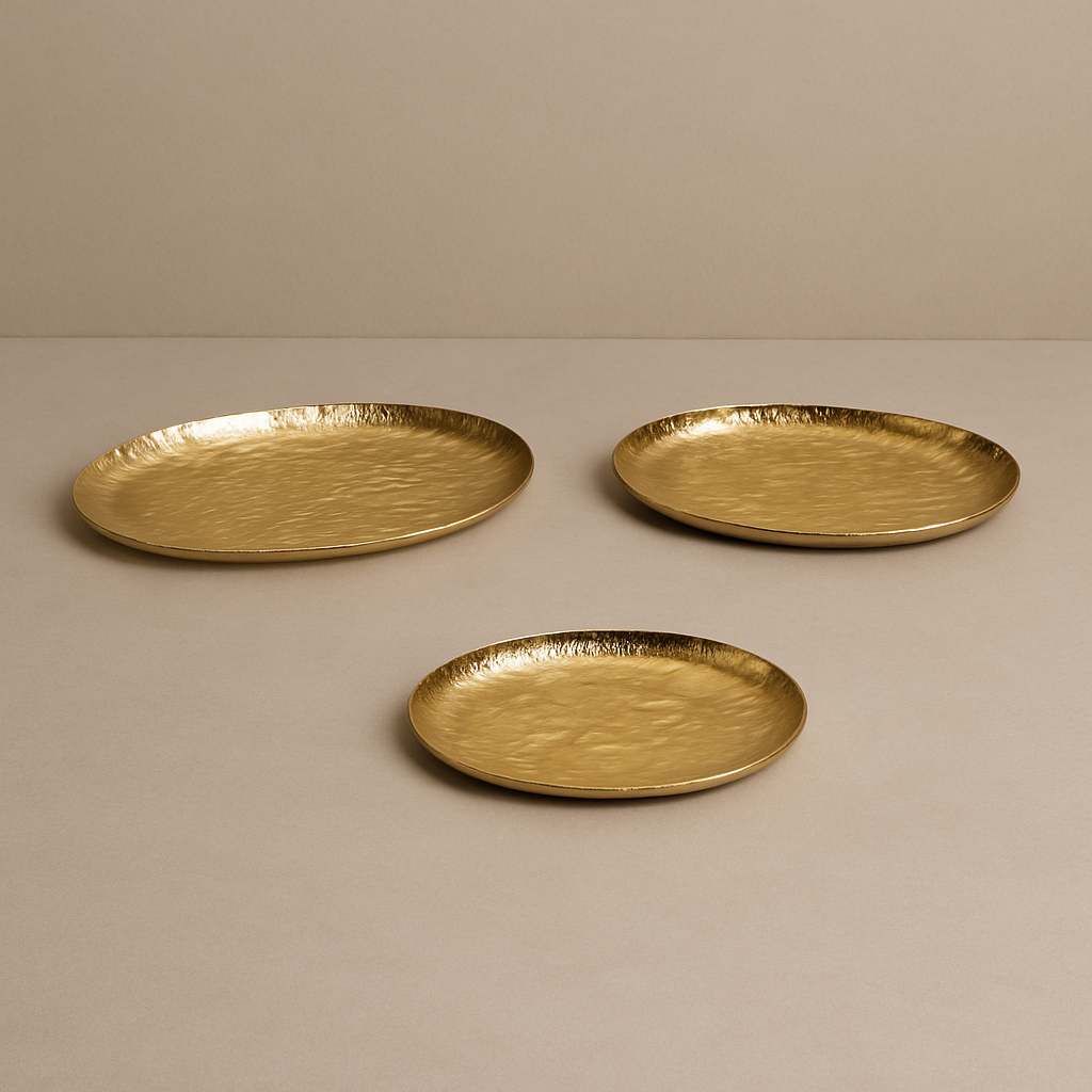 Sculpted with a rich, undulating texture, the Molten Dune Platter is a celebration of organic form and radiant metalwork. Its elongated oval shape and hand-forged surface catch light with every curve, echoing the patterns of shifting sands or liquid gold.