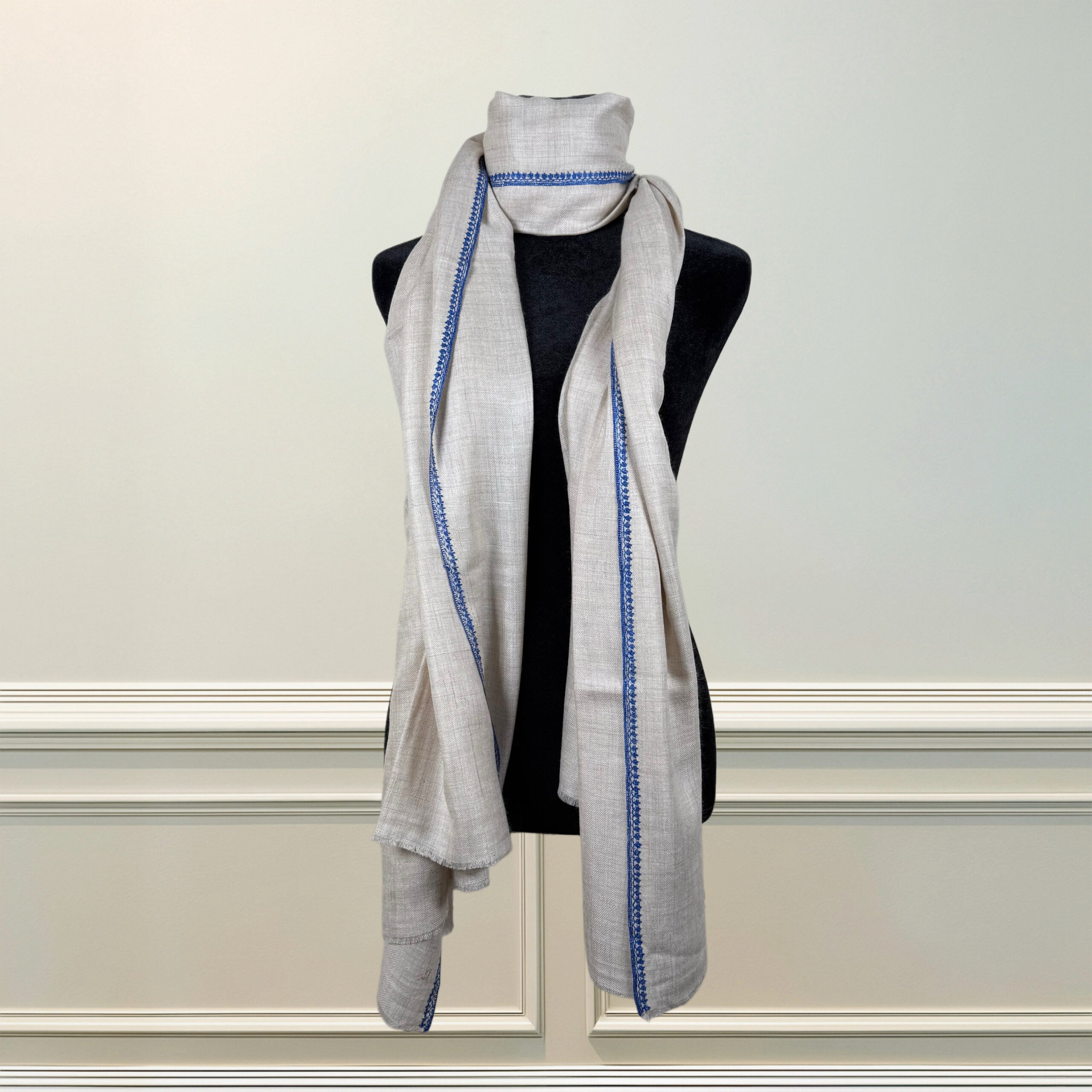Nilkaar Zahra (Blue Work of Light) is a study in quiet refinement—where simplicity becomes the canvas for profound artistry. This lightweight shawl, in a soft sand-beige base, features delicate linear embroidery in a brilliant indigo blue, reminiscent of the age-old “nilkaar” dyeing and hand-stitching traditions of Kashmir.