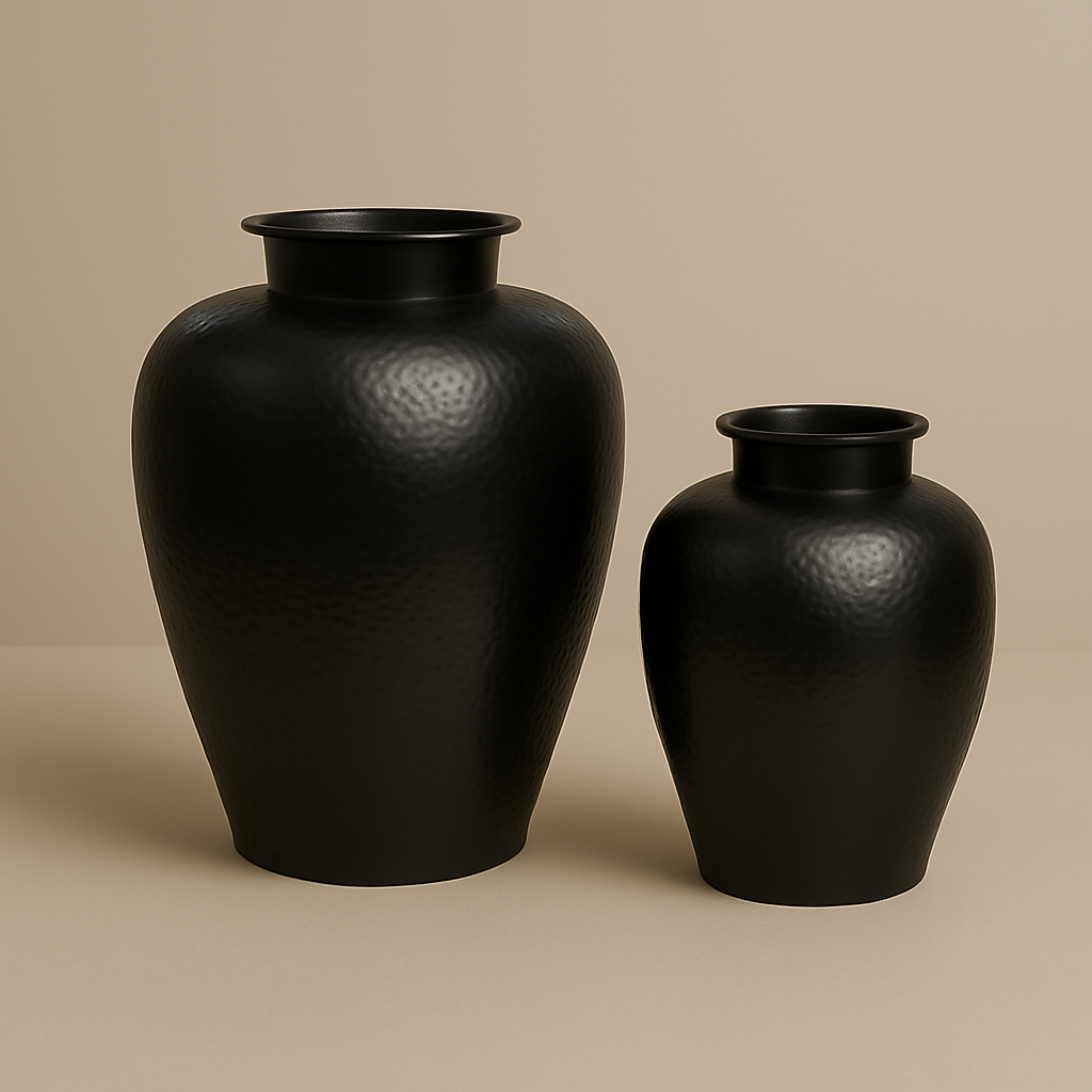 The Obsidian Forge Vase brings a commanding presence to any space with its deep matte-black finish and subtly hammered texture. Crafted from metal and shaped into a classic, full-bodied silhouette, it strikes the perfect balance between bold simplicity and artisan detail.
