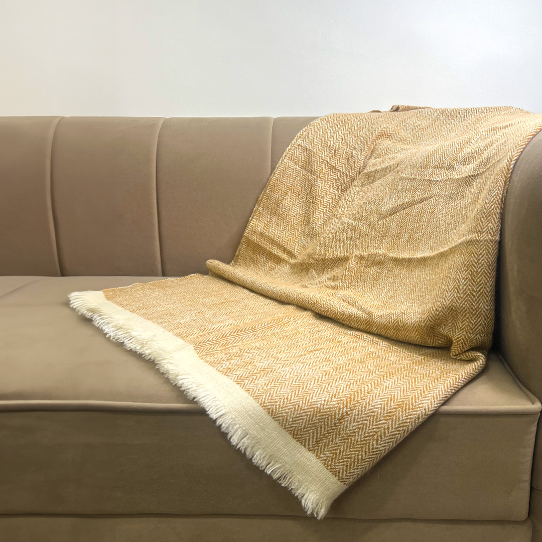 The Oro Sereno Throw is an ode to golden serenity—where warmth meets grace. Woven in a mellow ochre-gold with an intricate herringbone pattern and soft ivory fringe, this throw brings a gentle radiance to interiors. Its natural luster and featherlight drape make it an inviting accent across seasons.