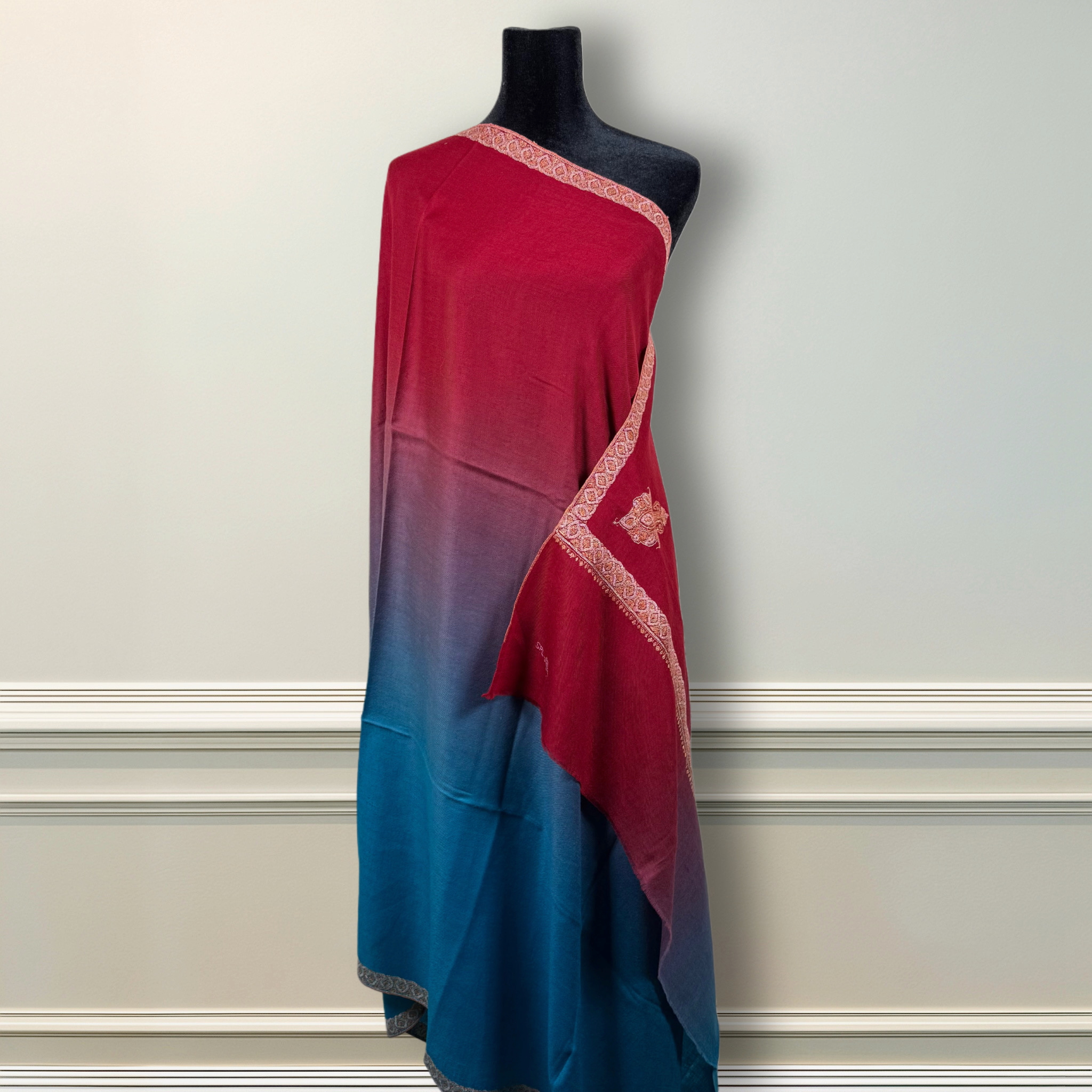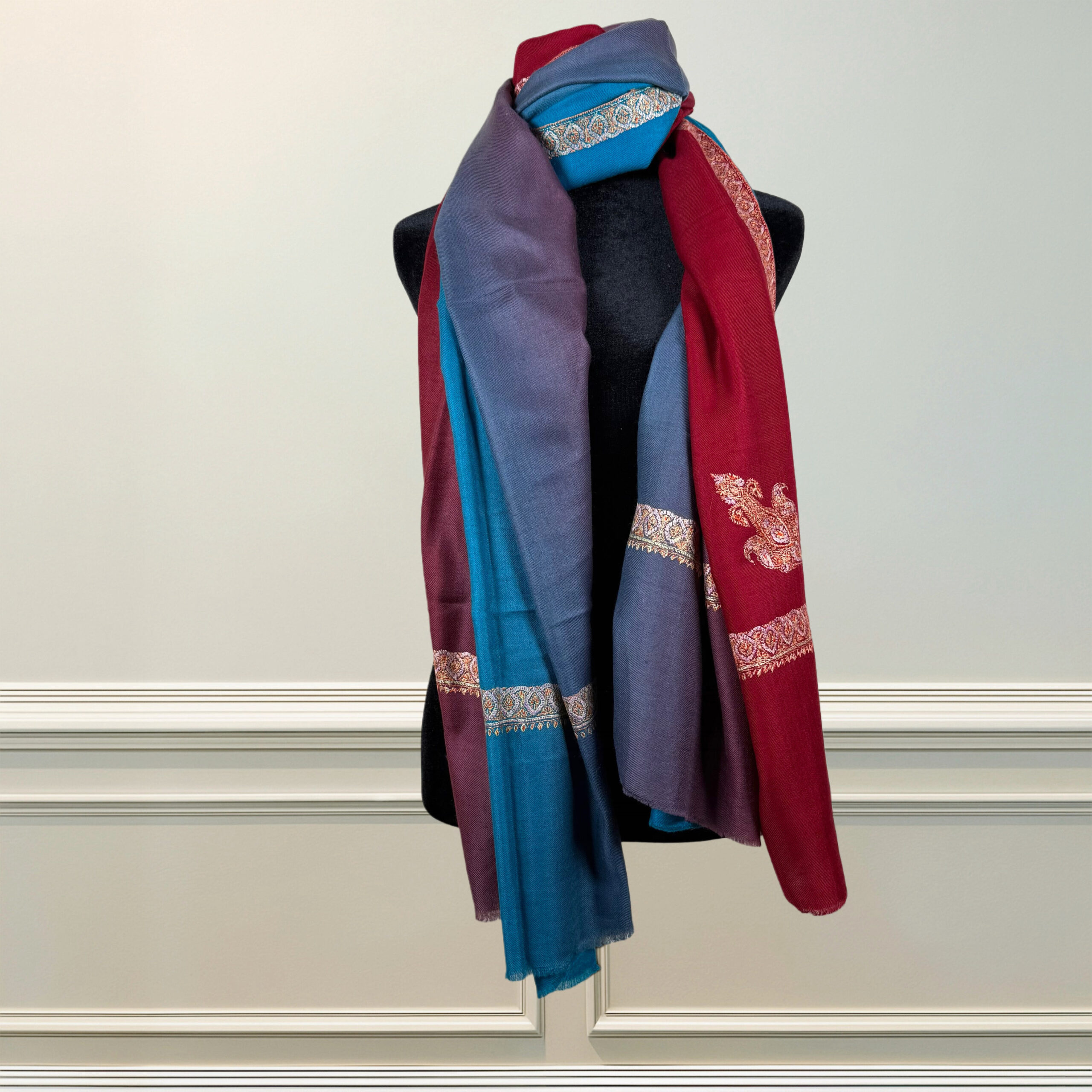 Bold yet regal, Rang Aftab is a celebration of light, hue, and heritage. This exquisite handwoven pashmina shawl features a striking triadic blend of deep crimson, smokey plum, and oceanic teal—each hue seamlessly flowing into the next, echoing the palette of a Himalayan dusk.