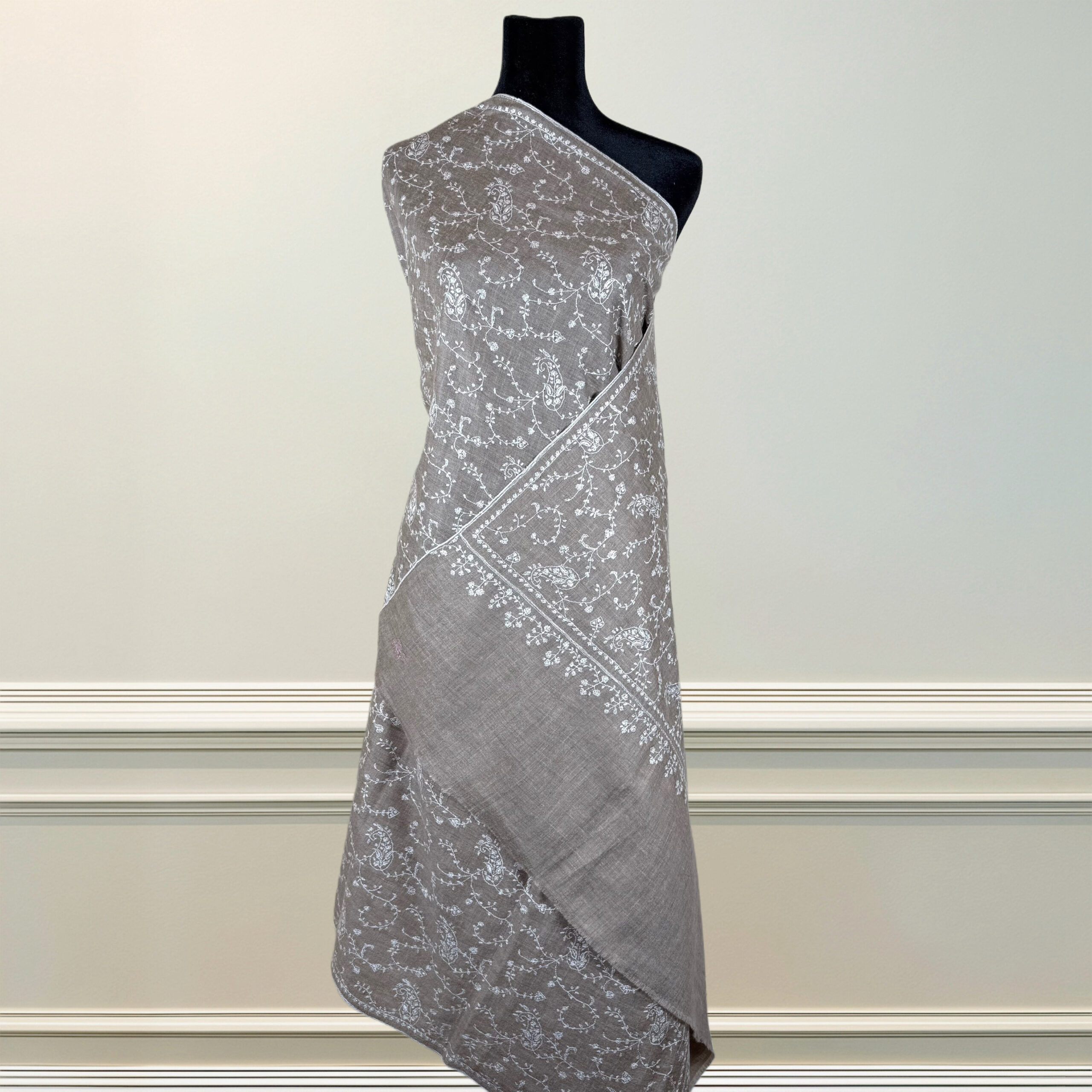 A timeless embodiment of refinement, Sabbia Fiorita is where softness meets sophistication. Crafted from whisper-light Ladakhi pashmina, this taupe-toned shawl is adorned with intricately hand-embroidered Sozni florals in pure white—a testament to the slow artistry of Kashmiri needlework.