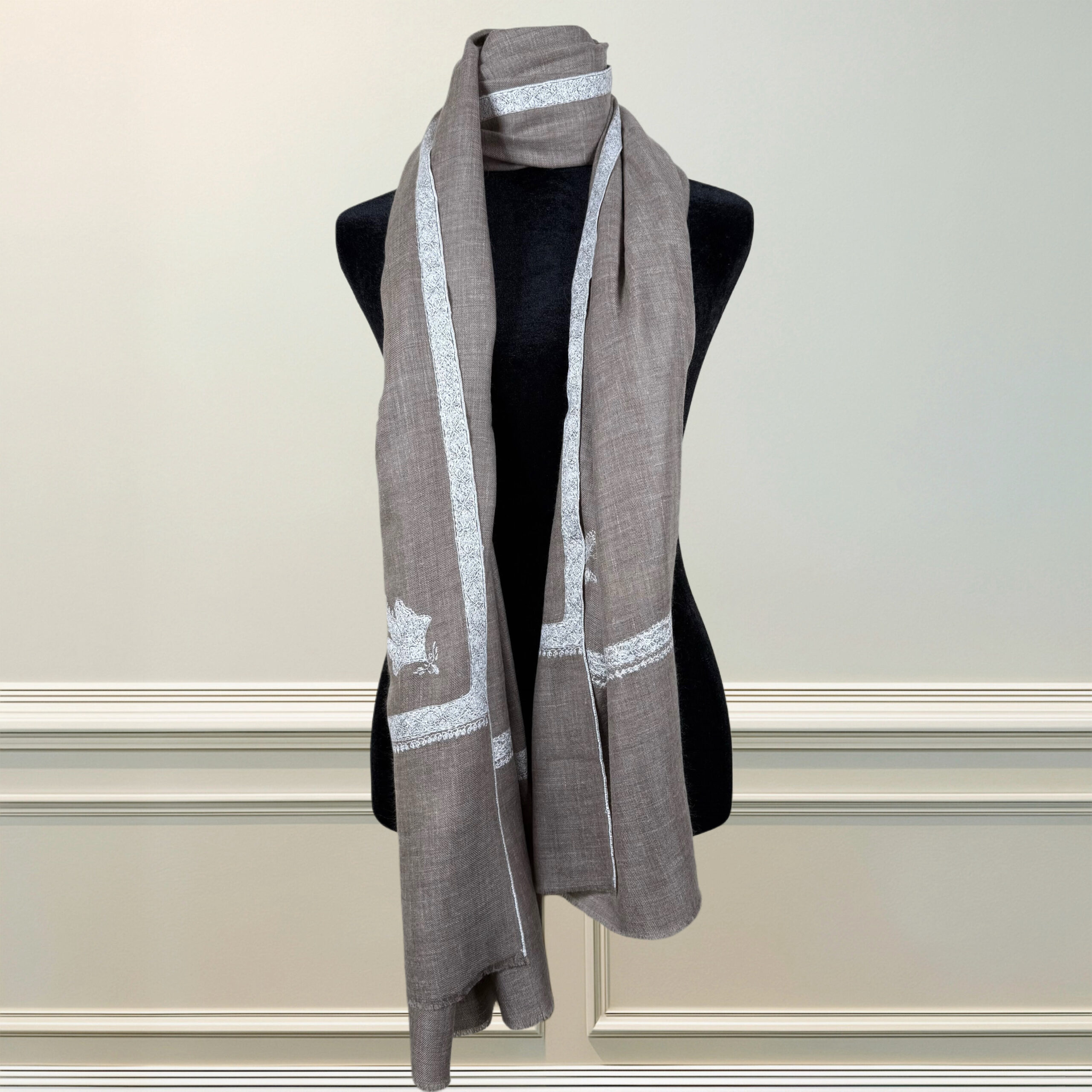 A shawl that evokes the gentle warmth of early morning light filtering through misty valleys, Sahar Dhoop (Morning Sunlight) is understated sophistication in motion. Crafted from the finest handwoven wool, its cool taupe hue forms a serene canvas for intricate white Sozni embroidery — minimal yet delicately ornate.