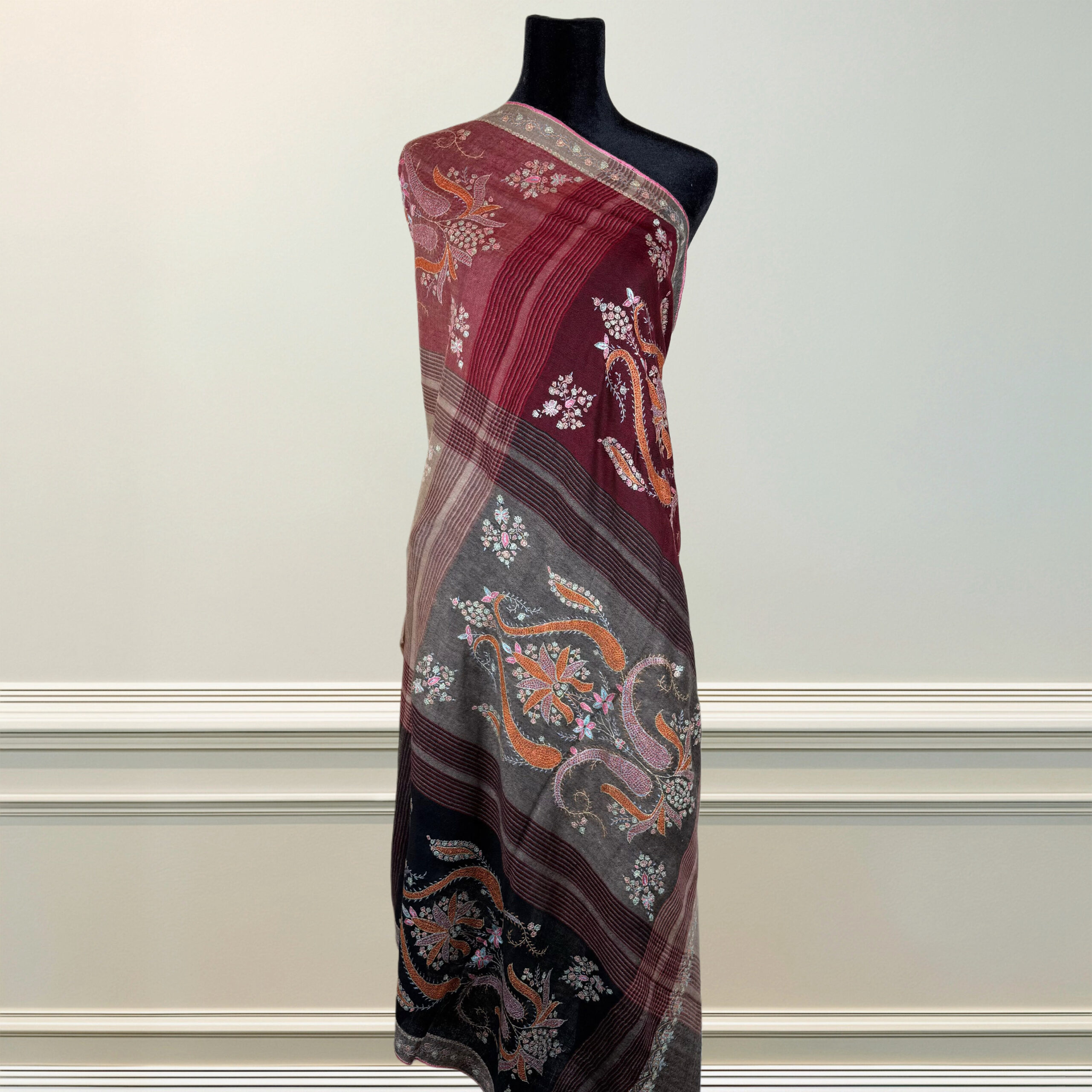 The Shaamkaar Pashmina Shawl captures the mesmerizing transition of day into dusk across the Himalayan skies. Its rich gradient of wine, ash grey, and charcoal reflects the evening horizon, while the hand-embroidered paisley and floral motifs in soft blush, peach, and ivory tones evoke the last glow of sunlight brushing against snow-dusted Chinar leaves.