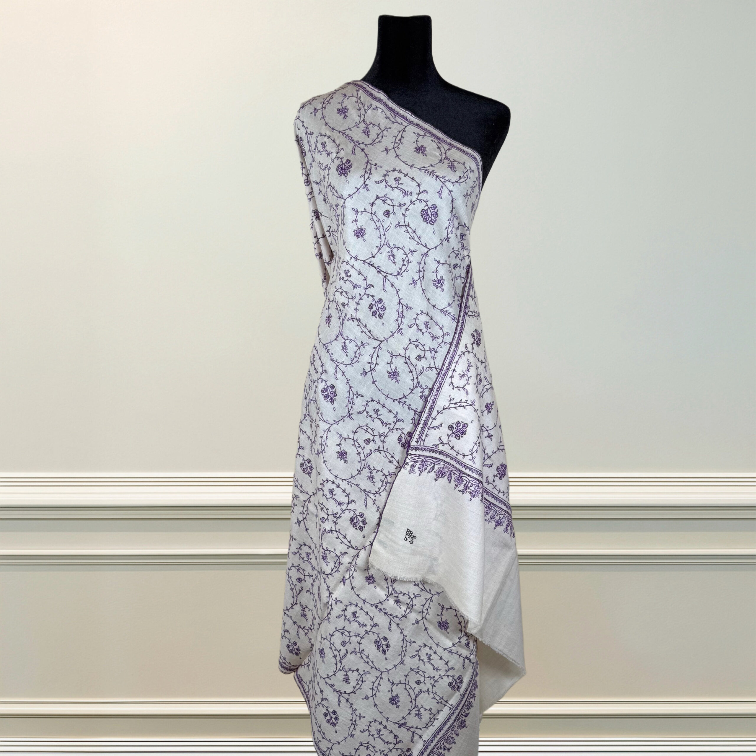 The Zabarwand Bloom shawl is an ode to Kashmir’s fleeting lavender fields — a serene canvas of ivory handwoven pashmina, adorned with delicate Sozni embroidery in muted lilac. Inspired by the elegant vine motifs of traditional Kashmiri gardens, each flourish is a quiet testament to centuries-old craftsmanship.