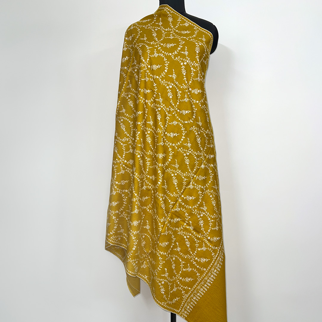 The Zafferano Fiorito shawl embodies the golden hues of late autumn and the intricate grace of alpine flora. Woven in a rich mustard base and adorned with delicate ivory sozni embroidery, its design traces elegant floral vines across a canvas of heirloom-quality pashmina.