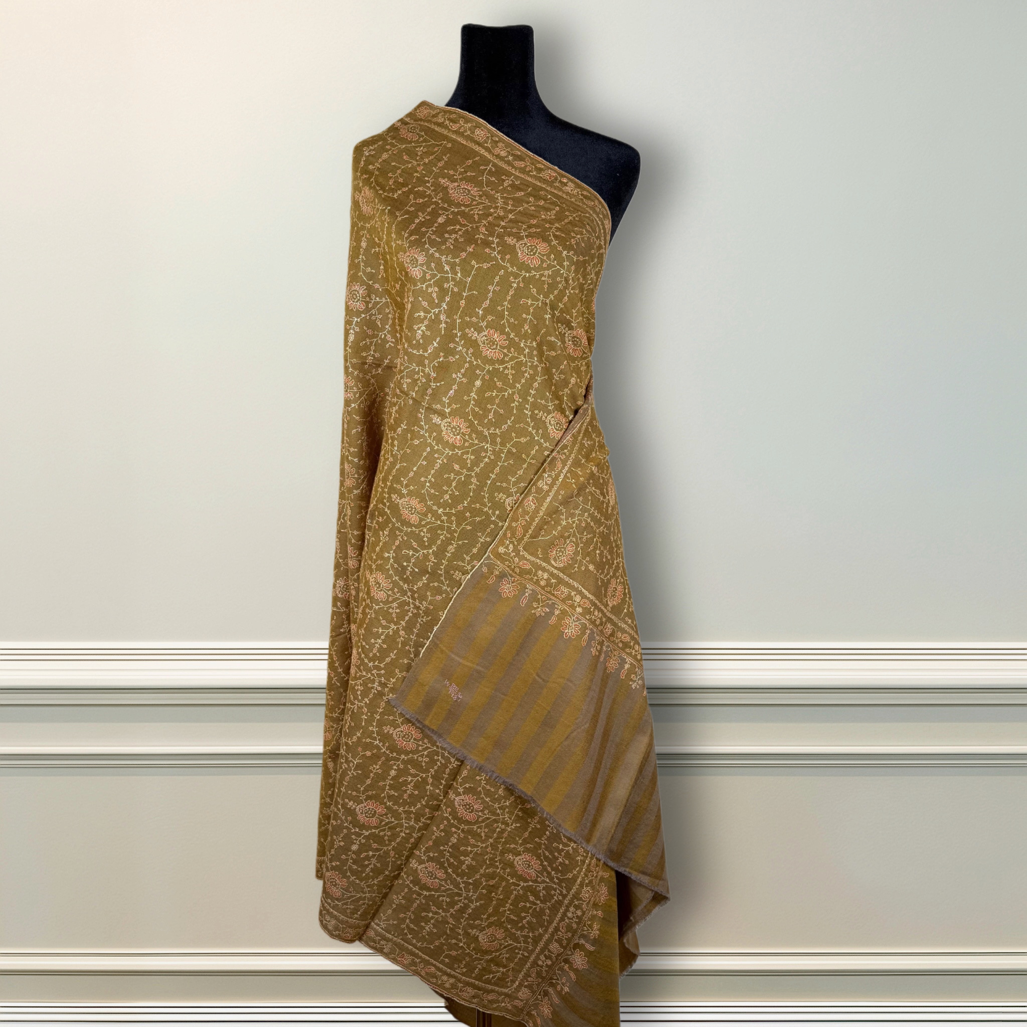 Earthy elegance meets intricate artistry in Zaitooni Gulzar — a handwoven Kashmiri Pashmina shawl inspired by the tones of olive groves and vintage gardens. This luxurious piece features a deep olive base embroidered with delicate blush and ivory Sozni work, forming an all-over lattice of floral vines and soft geometric symmetry.