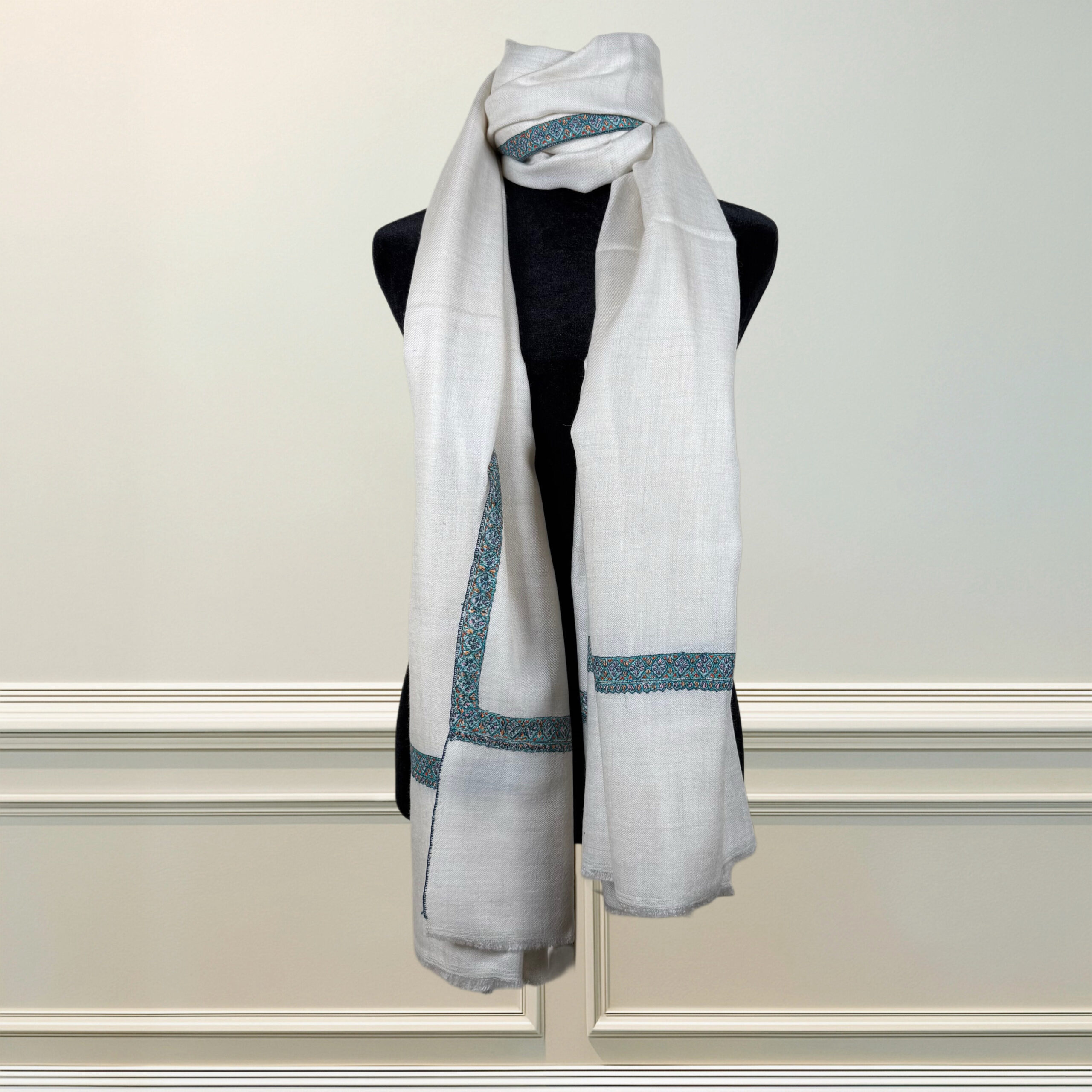 Ethereal in presence and exquisitely detailed, Zarafshan Noor (Light that Scatters Gold) evokes the quiet glow of morning light over snow-capped peaks. Crafted in feather-light fine wool, this ivory shawl is delicately framed with intricate hand-embroidered Sozni borders in deep teal, sapphire blue, and soft silver accents—echoing the richness of Kashmiri craft with understated elegance.