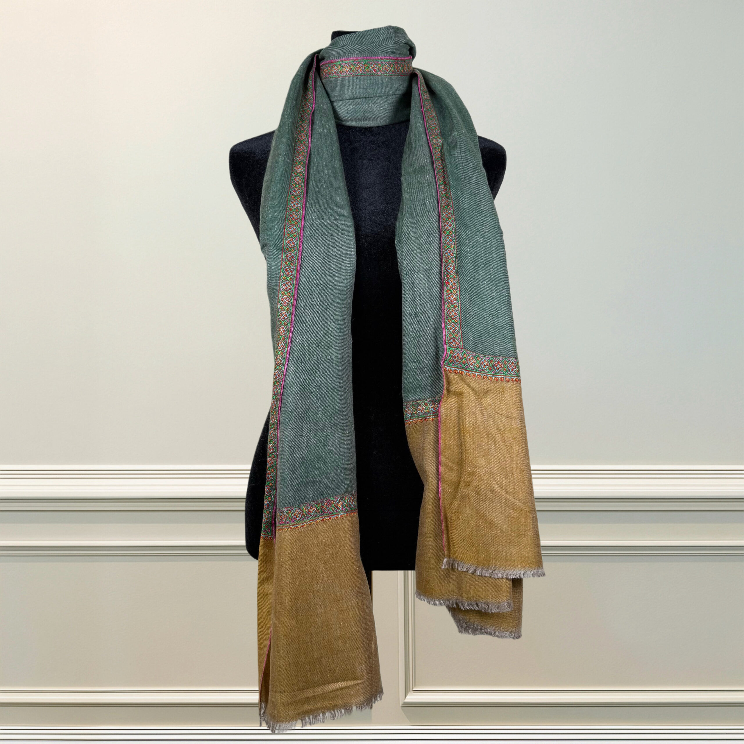 Handwoven in fine wool, this shawl features intricate multicolored embroidered borders in hues of berry, emerald, and ochre—echoing traditional Kashmiri motifs with a modern, asymmetrical spirit. Rustic, regal, and remarkably versatile, it brings the richness of the valley to your winter wardrobe.